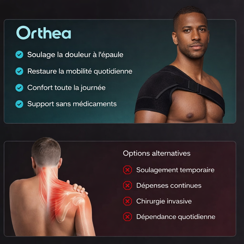 L'Orthèse d'épaule Orthea offre un soulagement efficace de la douleur, aidant à atténuer les inconforts liés aux blessures telles que les entorse accromio-claviculaires, déchirure de la coiffe des rotateurs ou la tendinite.